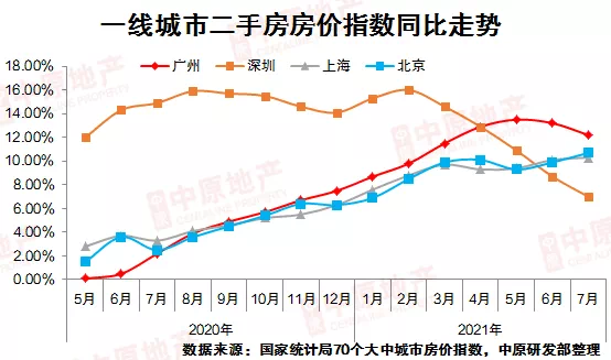 从70城二手指数同比走势来看,广州从去年6月起呈现爬升态势,调控势在必行;