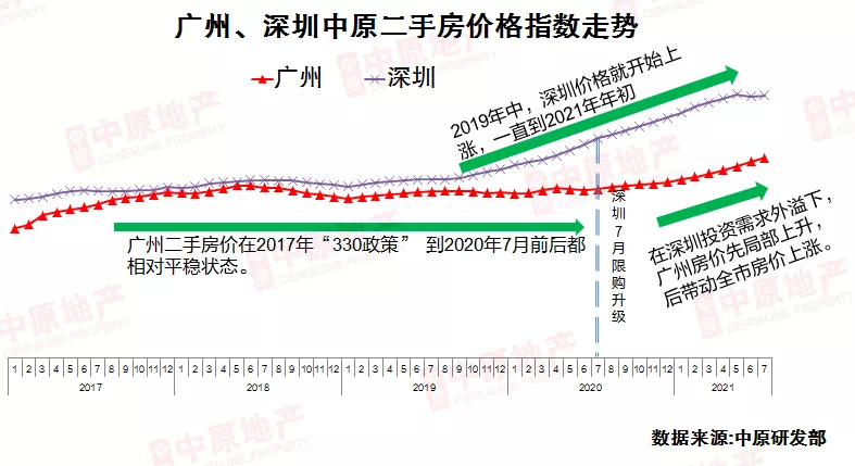 广州部分热区去年以来价格走高,主要原因为2020年7月深圳限购升级,导致投机客外溢广州所致。