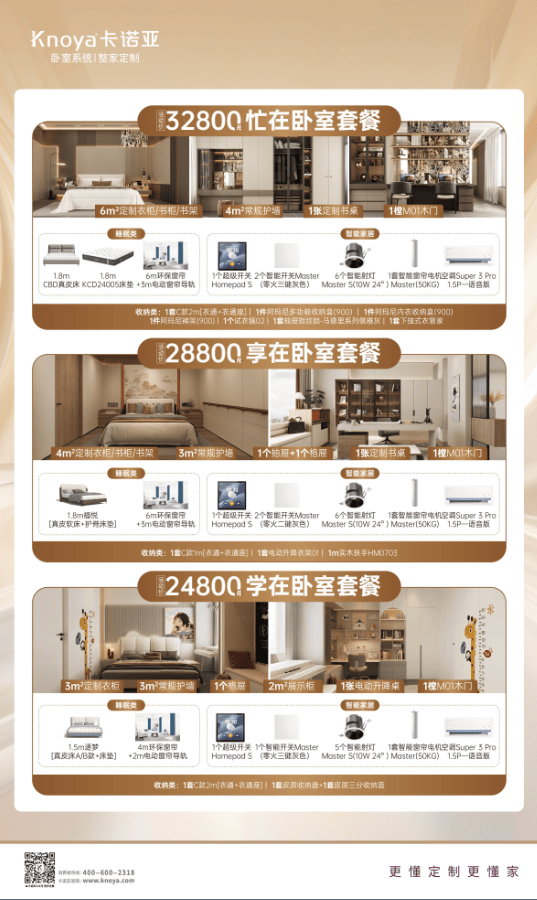 本次活动,卡诺亚还特别推出32800元忙在卧室套餐、28800元享在卧室套餐、24800元学在卧室套餐等,涵盖卧室系统+整家定制2大品类,包含定制柜、护墙板、全屋家具及智能家电,同时携手芝华仕、CBD、云米科技等多个高端品牌,致力于为消费者打造舒适、便捷且极具品质感的理想卧室空间。