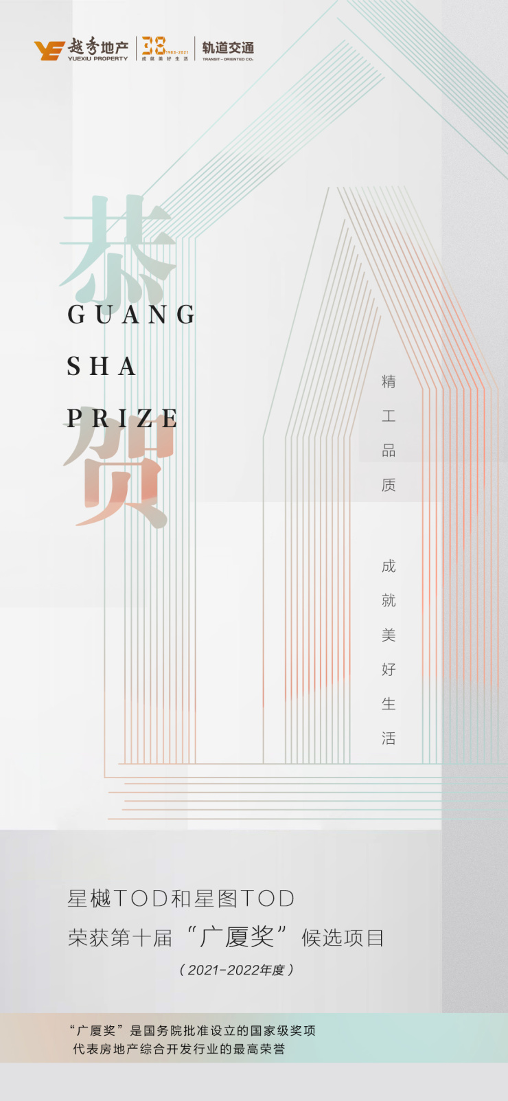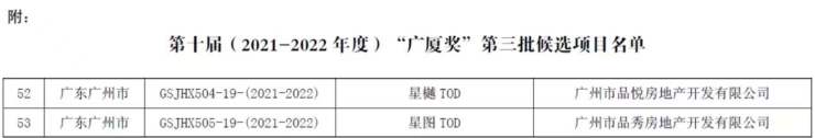 2021年12月29日,第十届(2021-2022 年度)“广厦奖” 第三批候选项目的通报新鲜出炉。55个全国获奖项目名单中,广东广州仅两个作品,均来自于广州地铁与越秀地产共同打造的项目——星樾TOD和星图TOD。本次荣获第十届(2021-2022年度)“广厦奖”候选项目的盛誉,充分证明了越秀地产在深耕大湾区、精拓广州的发展过程中,精工品质、技术支持和创新设计等均达到高级奖项的参评标准。