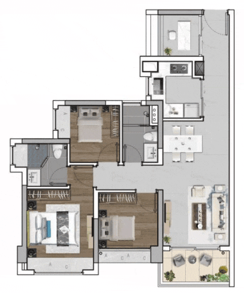 相较于板块内同类型产品,珠实·云悦花语做到了同等面积多一个房间。如建面约79㎡户型做到了3+1房2厅2卫,三开间朝南,居住舒适度高。