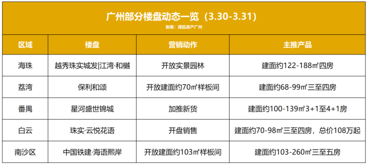 据搜狐焦点不完全统计,本周末(3.30-3.31)广州多盘有营销动作,涉及越秀珠实城发|江湾·和樾、保利和颂、珠实·云悦花语、中国铁建·海语熙岸、星河盛世锦城等。