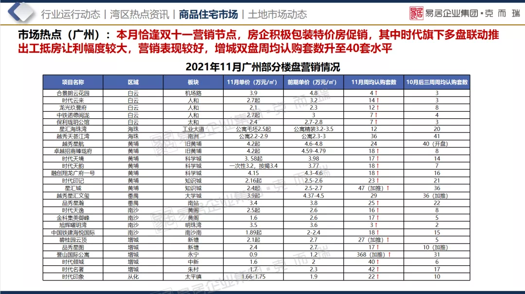 同时,克而瑞观察到,在叠加信贷环境持续改善,利率出现下滑的背景下,恰逢双11节点,广州房企陆陆续续推出特价房降价促销、刺激购房者消费需求!