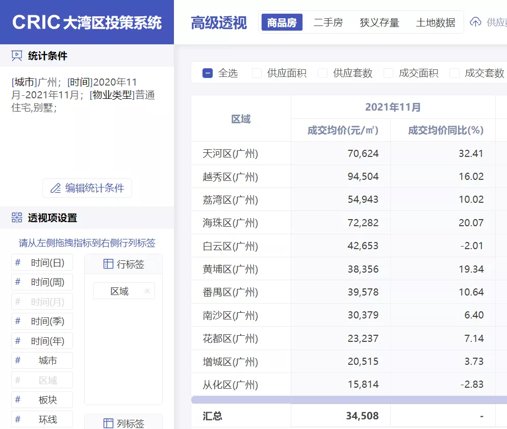 具体到各个行政区域,CRIC显示,11月各区一手成交均价仅白云区和从化区同比下跌,其余9区均是同比上涨!