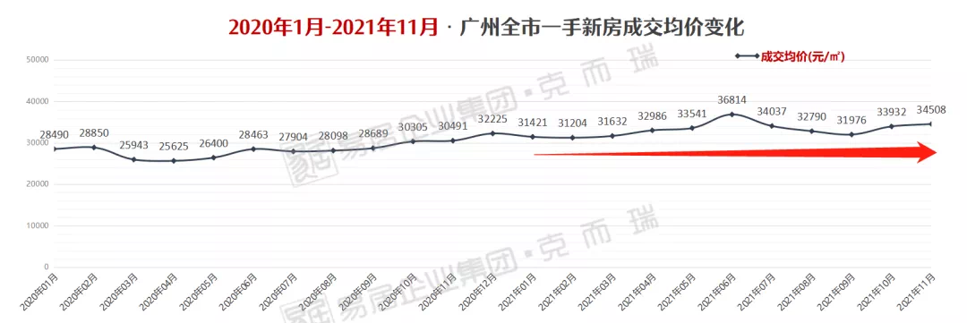 无独有偶,从近两年的一手成交均价看,即使是下半年行情走低,广州全市成交均价都牢固的锁在3字头!值得一提的是,11月广州一手成交均价为34508元/㎡,环比上涨2%;抽丝剥茧,主要是受荔湾万科金域曦府(53585元/㎡)、南沙湾区金融城(36126元/㎡)等中高价项目集中补录影响,成交均价结构性上涨。
