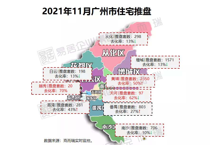 据克而瑞市场监测,虽然11月广州整体推货的开盘去化率仅30%,但实际上各区去化表现持续分化:天河和越秀去化率保持在六成以上,荔湾和黄埔推货量和去化率环比齐涨,其中黄埔主力盘为旧黄埔和科学城“缺货”网红盘,去化率升至50%;番禺新货供应充裕,和樾府和亚运城豪宅产品去化较好,支撑全区开盘去化率微涨;外围四区项目推新意愿下降,去化率均不足两成。