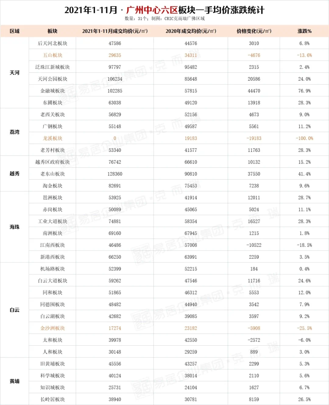 中心六区中,10字头天花板再添新;CRIC数据显示,2021年1-11月金融城一手住宅均价为102285元/㎡,晋级10字头,另外老东山板块和天河公园板块一手均价也破10万元/㎡。从年度涨幅看,中心31个板块中,仅5个板块出现负值,其中五山板块、龙溪板块和金沙洲板块存在低位补签和零成交,参考度较低,仅余海珠区江南西板块一手均价下跌18.5%,白云区人和板块已售均价下跌6%。
