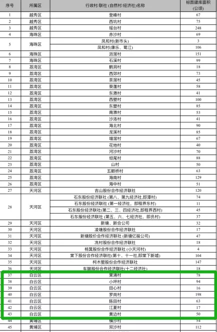 83条城中村名单中,旧村庄改造三年计划项目白云有7个,包括陈田村、小坪村、田心村、江夏村、黄边村、棠涌村、罗岗村。