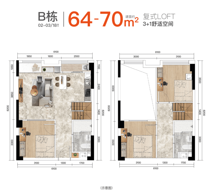 建面约64-70m2 复式LOFT 2+1舒适空间