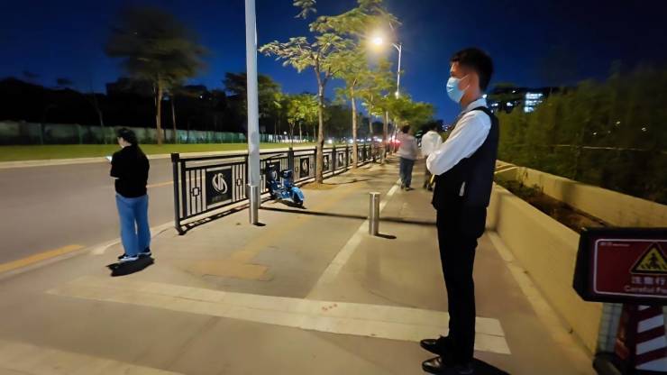 2分钟后,当朱玲走到办公楼外的候车区时,正在值班的物业保安迎了上去,陪着她等待网约车的到来。直至朱玲坐上车离开,保安这才返回自己的岗位。