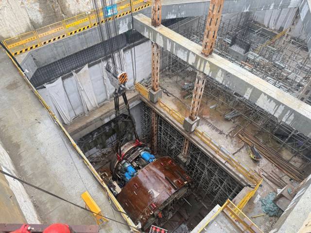 由于盾构始发井与人和站主体结构施工共用场地,交叉施工组织困难,且盾构机吊装时履带吊站位区临近附近的变电站,为保障盾构场地布置、下井组装工效,避免盾构吊装对变电站的影响,建设者提前对吊装方案进行优化,优化履带吊站位和设备选型,细化模拟各个构件下井工况,在不影响人和站主体结构施工和变电站运转的情况下完成盾构组装下井各项工作。