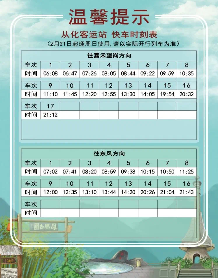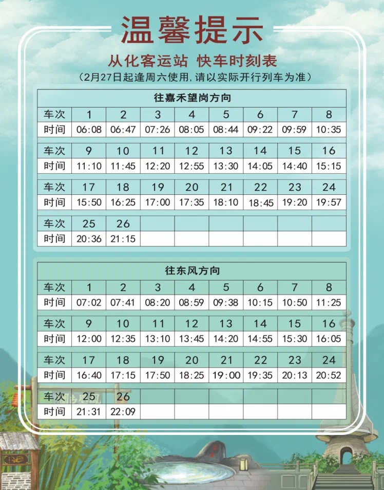 同时,快车的实际时间会根据运营情况有所调整,此时刻表仅做参考,搭乘时请以车站现场广播和电视上的列车信息为准。