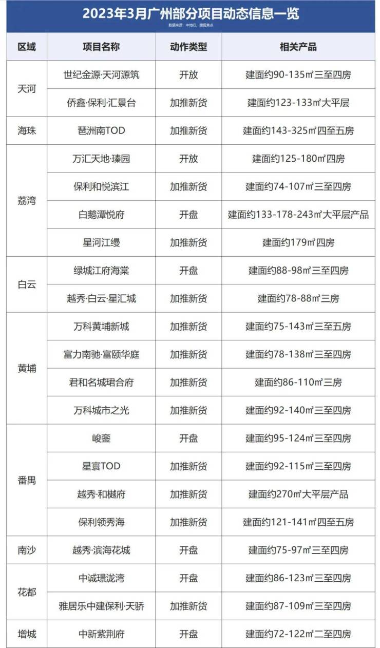 据搜狐焦点、中地行不完全统计,3月广州全市约20个项目有动作,覆盖天河、荔湾、海珠等9个区。