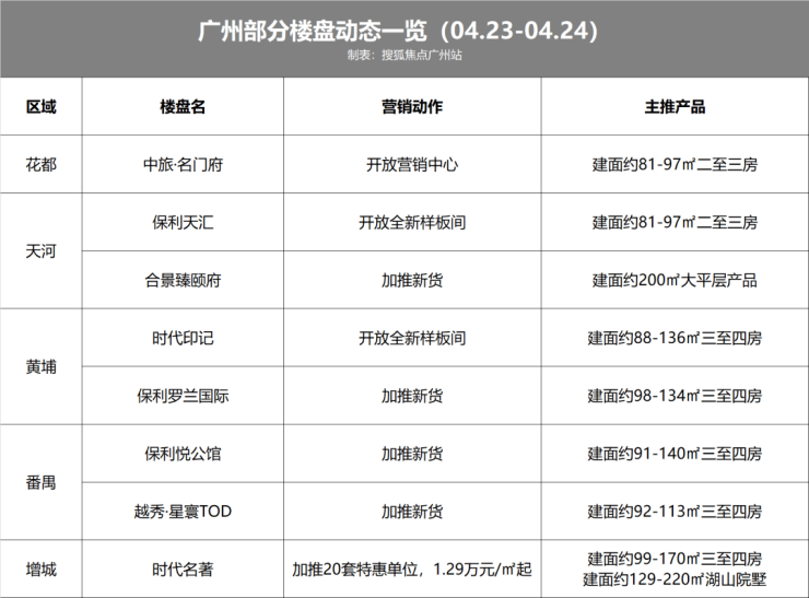 如万科黄埔新城、广州绿城桂语汀澜计划于4月30日开放全新样板间;越秀联投知识城·居山涧 即将开放营销中心。