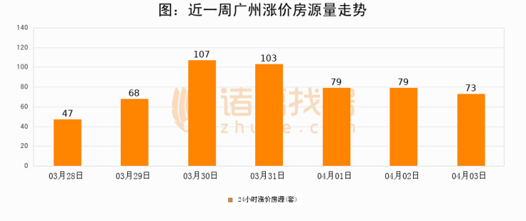 根据诸葛找房数据显示,广州24小时涨价房源量为73套,较04月02日减少6套,环比下降7.6%。与此同时,涨价房源占比小幅回落,对于购房者来说是一个入市窗口期,购房者可抓住时机入市。