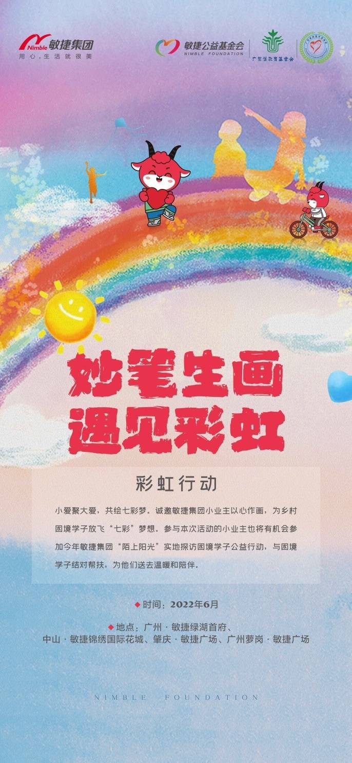 小爱聚大爱,共绘七彩梦。彩虹行动将邀请敏捷集团小业主进行主题绘画创作,孩子们的画作将作为爱心礼物送到敏捷公益基金会帮扶的乡村困境学子手上,为乡村困境学子放飞“七彩”梦想。同时,本次活动参与者还将有机会参加今年敏捷集团“陌上阳光”实地探访困境学子公益行动,与困境学子结对帮扶,为他们送去温暖和陪伴。