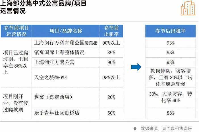 以上海为例,在最近的调研过程中,部分租赁项目和租赁运营商一致反馈,节后出租率开始出现明显上涨,客户转化率也明显提高。根据克而瑞租售调研数据,已渡过爬坡期、出租率超85%的项目,节后出租率普遍提升3%-5%,而项目开业不久、出租率不超50%的项目,节后出租率提升10%-20%。