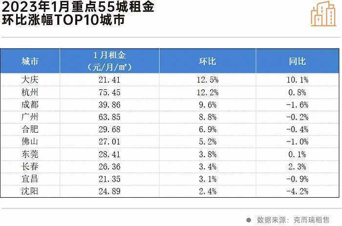 再来看租金。克而瑞租售监测的55城中,1月有超过六成城市租金环比上涨,环比最大涨幅达到12.5%。