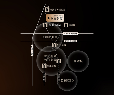 项目位于广州中轴之上,属于天河北板块,周边有广垦天河壹号商业MALL、信达金茂广场等,约5公里范围内汇聚天河城、天环、正佳广场、太古汇等的天河路商圈,驾车约20分钟即可到达。