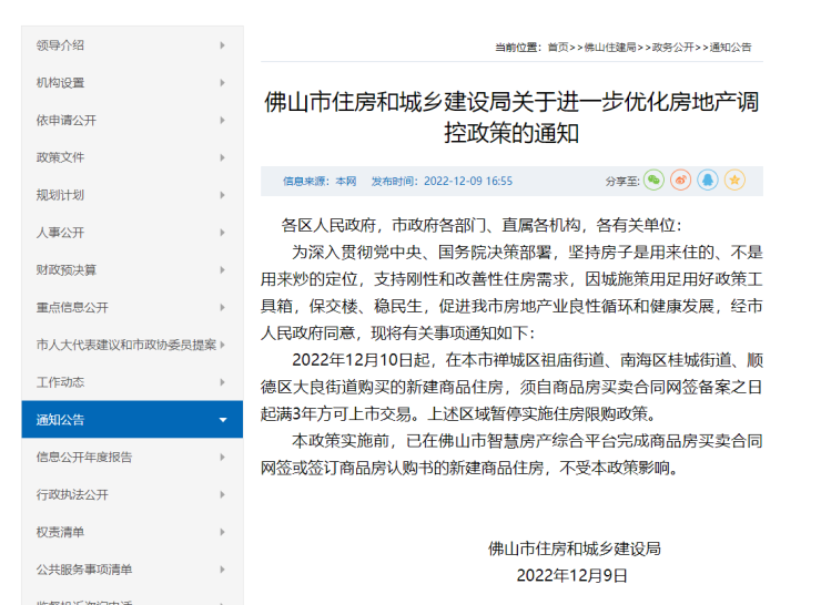 12月9日,佛山市住建局发布《佛山市住房和城乡建设局关于进一步优化房地产调控政策的通知》,明确2022年12月10日起,在本市禅城区祖庙街道、南海区桂城街道、顺德区大良街道购买的新建商品住房,须自商品房买卖合同网签备案之日起满3年方可上市交易。
