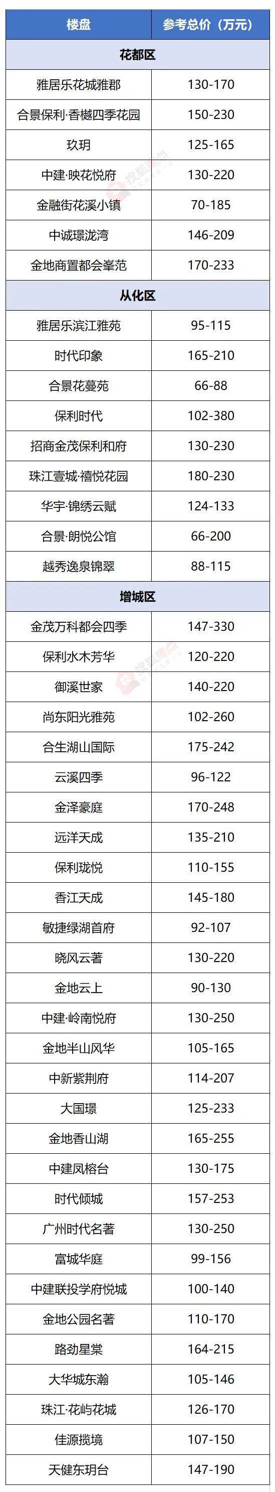 相对比增城,花都、从化两区的选择空间不算大。不过,这两个区竟然还有4个盘的部分房源,总价还不过100万元。