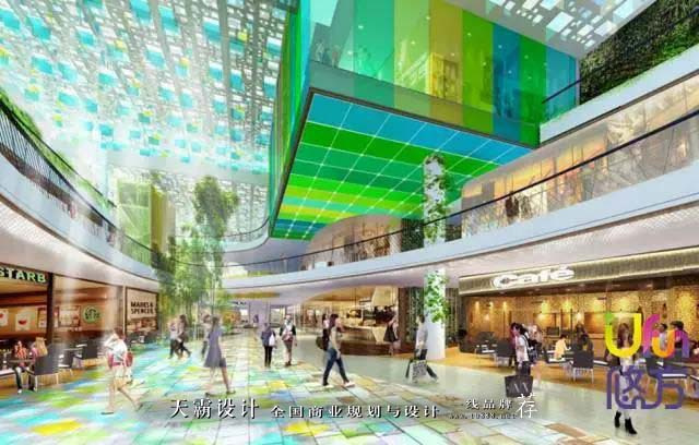 从设计方案中我们可以看到,整个室内装修设计是以大线条以及绿化园林景观进行贯通,商业空间所有的标志系统都装饰设计有绿植。消费者步入广州悠方这一购物中心内部,就犹如身处绿荫小径,整个商业空间都弥漫着自然的气息。