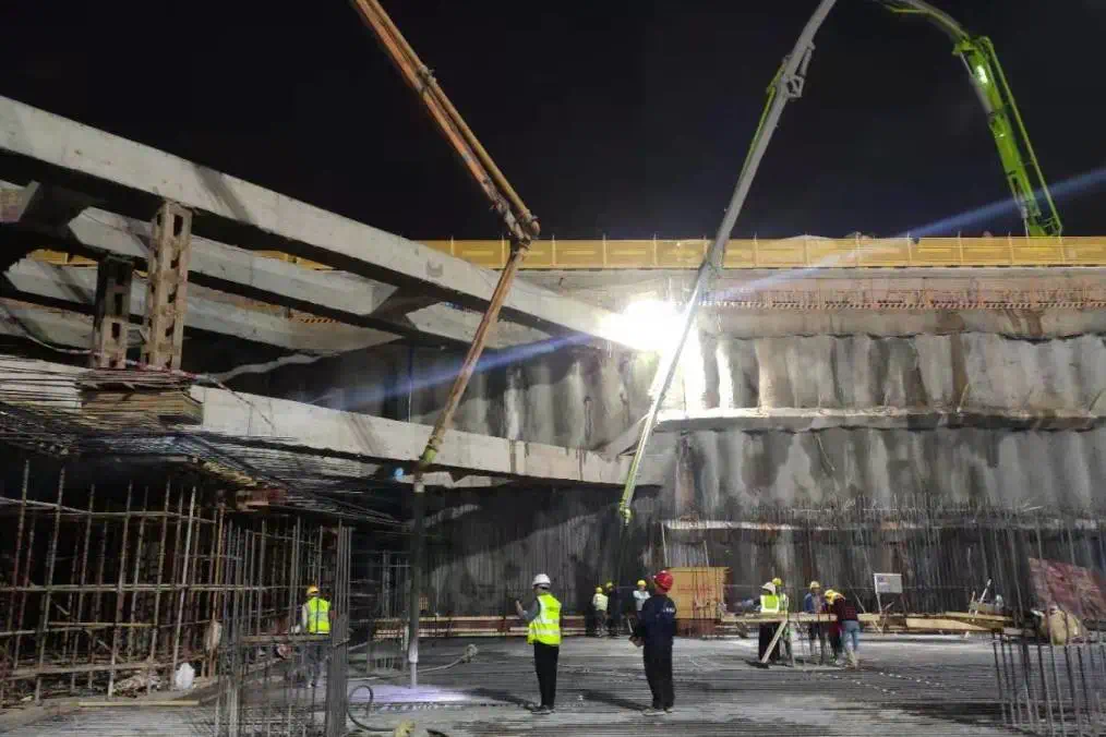 施工现场, 5台天泵、15台震动泵同时运转,20余名管理人员24小时轮班值守,95名工人三班轮换,70台混凝土罐车进出频繁。
