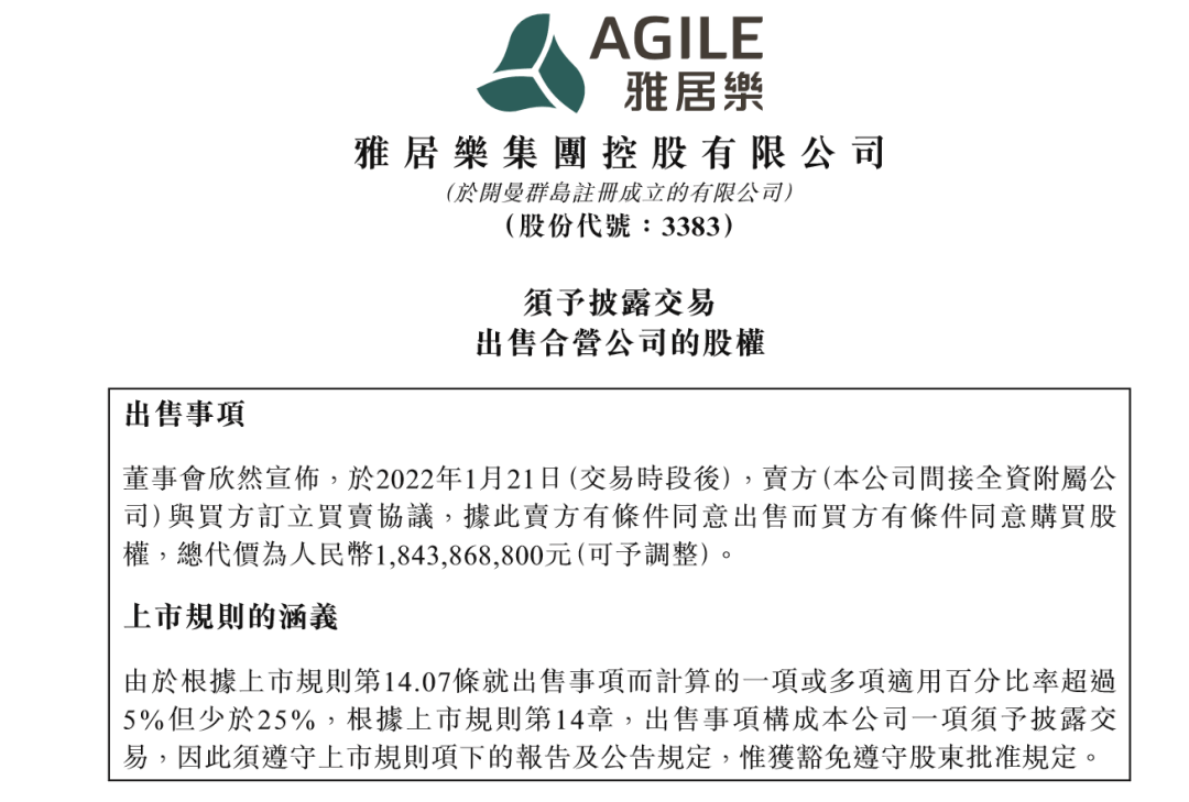 1月24日,雅居乐集团公告,拟以18.43亿元人民币出售广州利合集团26.66%的股权,已于2022年1月21日与买方(中国海外发展有限公司的间接全资附属公司)签订协议,代价包括13.8亿元现金及买方应付予广州利合集团的贷款金额46386.88万元,合计约18.43亿。