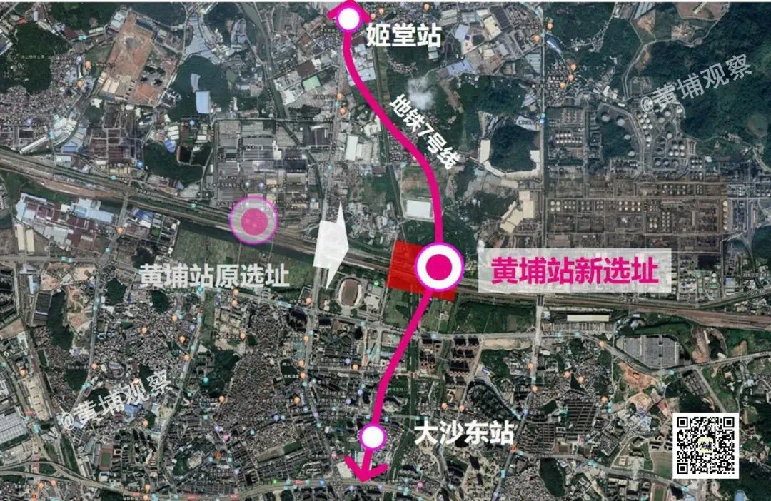 7号线规划建设在前,在大沙东站与姬堂站区间,未设站;另外,高铁黄埔站(即黄埔新客站)最初规划在黄埔体育中心以西地块,与7号线线位距离也去到了1.3公里,换乘起来也很不方便。