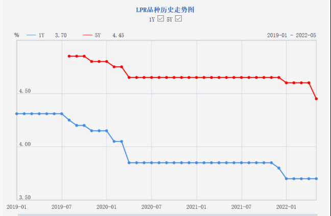 中国人民银行授权全国银行间同业拆借中心公布,2022年5月20日贷款市场报价利率(LPR)为:1年期LPR为3.7%,较上月维持不变;5年期以上LPR为4.45%,较上月下调15BP。