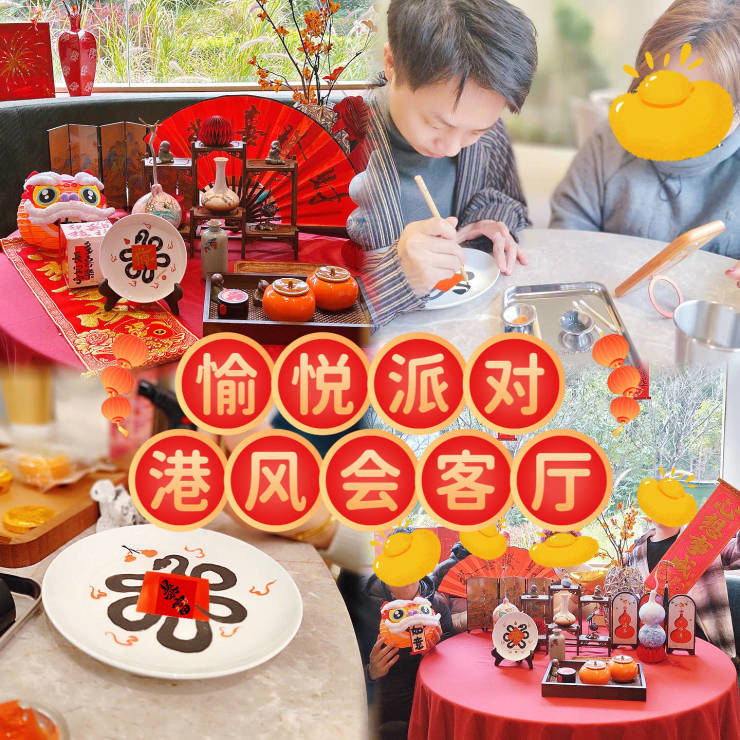 从大年初二启市开始,一大早已有客户和业主满怀热枕,呼朋引伴,携着亲友纷至沓来,在“愉悦派对港风会客厅“打卡点与财神爷拍照留念,在幸运红包墙抽好运发财利是,品鉴港风发财茶歇,现场还有「继续广彩」非遗瓷器瑰宝新春特展以及非遗文化 workshop ,手作课堂涵盖广彩、非遗葫芦漆器、非遗螺钿等传统技艺,处处洋溢着浓厚新春气息。