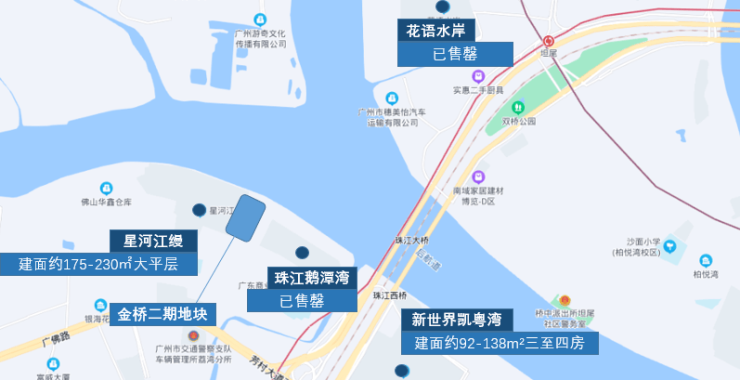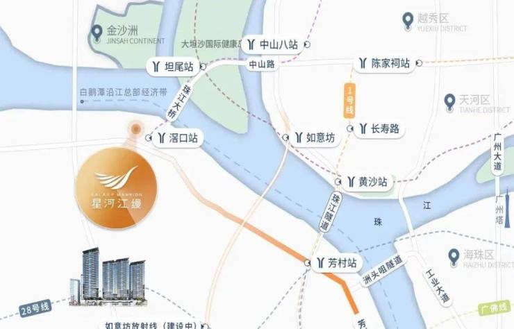 星河江缦位于荔湾区滘口大街与鹅潭路交叉口,隔江对望金沙洲和大坦沙国际健康岛。