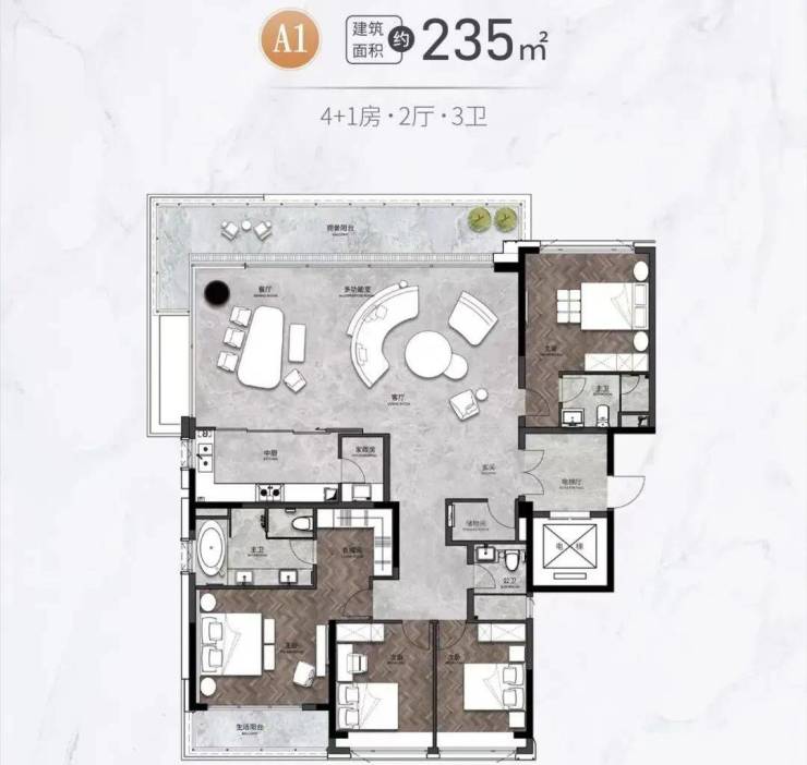 其中,5#距离江岸最近,主推建面约235㎡4+1房2厅3卫。