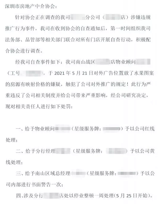 5月25日,深圳市房地产中介协会发布通告,表示深房中协配合市住建部门于排名前列时间现场检查,确认其违规事实后,暂停该机构全线网签权限,约谈该机构、门店负责人,要求该公司于5月24日当天全线整顿,停止一切违规发布房源广告行为,并进行内部自查自纠。