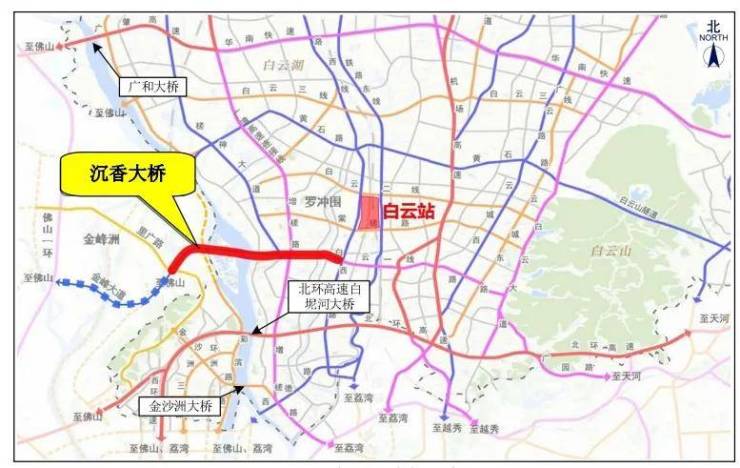 一旦建成通车,沉香大桥不仅可缓解金沙洲地区的交通拥堵问题;也可实现金沙洲地区快速到达广州市中心区域的交通需求;并且可有效支撑白云站的交通需求,进一步提升白云站的辐射及服务能力;另还可使得金沙洲、罗冲围片区、白云数字科技城和白云新城形成联动发展,发生化学反应。