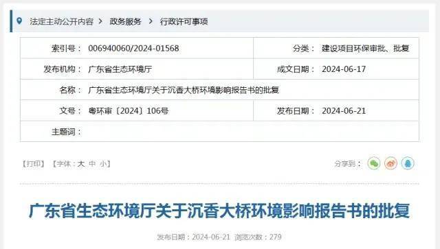 近日,广东省生态环境厅官网发布关于沉香大桥环境影响报告书的批复,原则同意报告书中所列建设项目的性质、规模、地点和拟采取的环境保护措施。