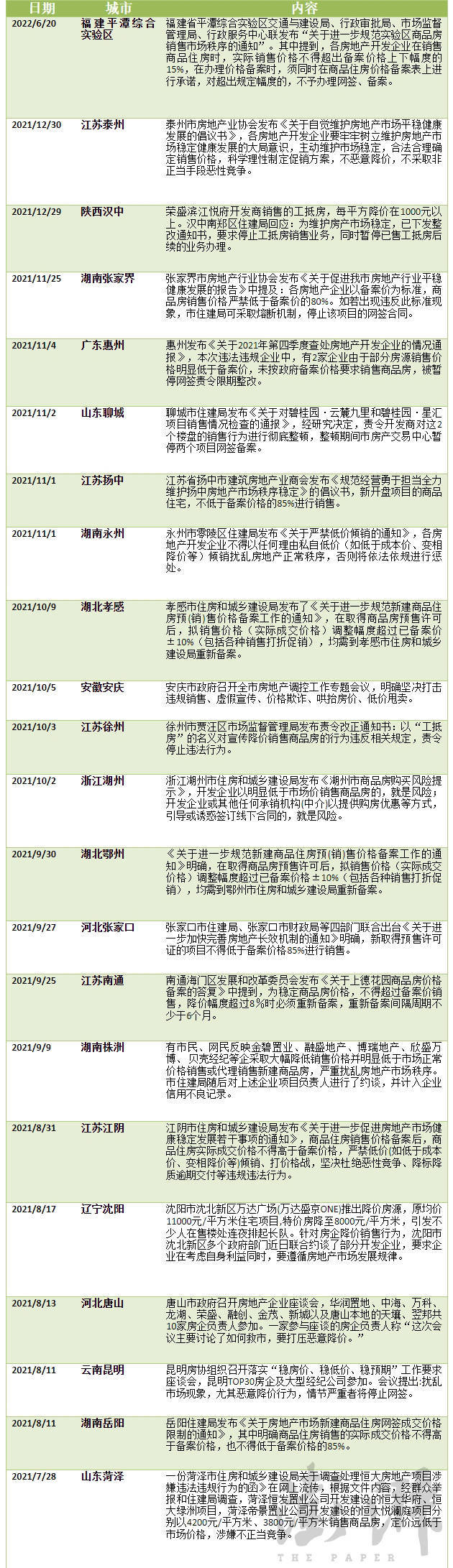 据澎湃新闻不完全统计,去年下半年以来,至少包括山东菏泽、湖南岳阳、云南昆明、河北唐山、辽宁沈阳、江苏江阴、湖南株洲、河北张家口、湖北鄂州 、江苏徐州 、江苏泰州、安徽安庆、浙江湖州、湖南永州、湖北孝感、江苏扬中、江苏南通、山东聊城、广东惠州、湖南张家界、陕西汉中、福建平潭综合实验区等22个地方发布政策或引导房企不得随意降价销售。