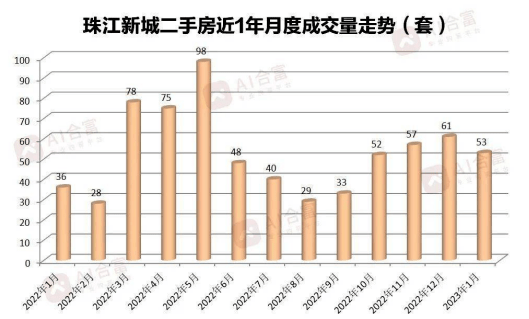 据合富研究院数据显示,2023年1月珠江新城二手市场共成交53套房源,总成交金额达到83725万,总成交面积为5803.68平方米(建面)。对比2022年1月,成交量增加17套, 即同比增长47.2%。