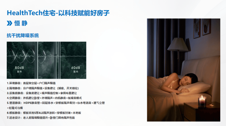 “HealthTech健康科技系统”——聚焦空气、水、光、声、材五大健康要素进行科技赋能。“6恒系统”——以恒温、恒湿、恒氧、恒洁、恒静、恒智六大维度构建舒适基准: