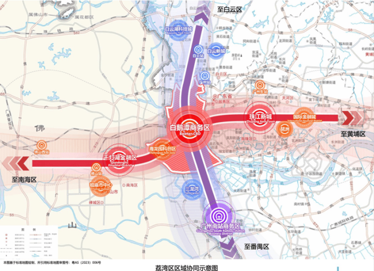 在《广州市荔湾区国土空间总体规划(2021-2035)》(以下简称《总规》)新发展空间蓝图中,擘划的一条联动东西、纵观南北、连接广佛多个CBD的“十字发展轴”,“轴心”就在荔湾白鹅潭商务区。