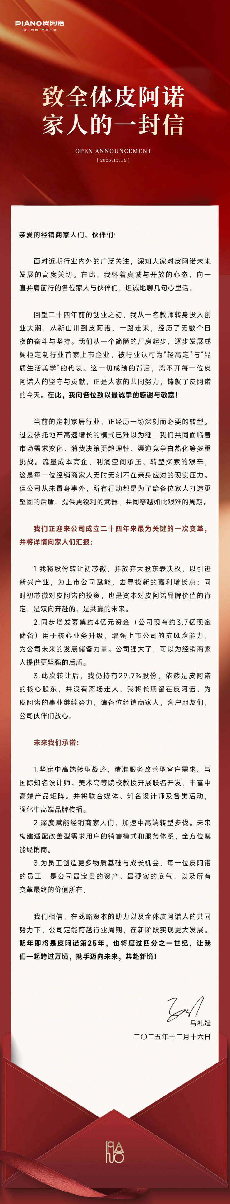 12月17日,皮阿诺创始人马礼斌向全体经销商及合作伙伴发布题为《致全体皮阿诺家人的一封信》的公开信,回顾品牌二十年发展历程,并阐述未来战略方向。