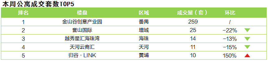 本周广州公寓市场持续零供应,但成交量倍增,冲至458套的高位。本周将近6成成交量来自番禺区金山谷创意产业园。