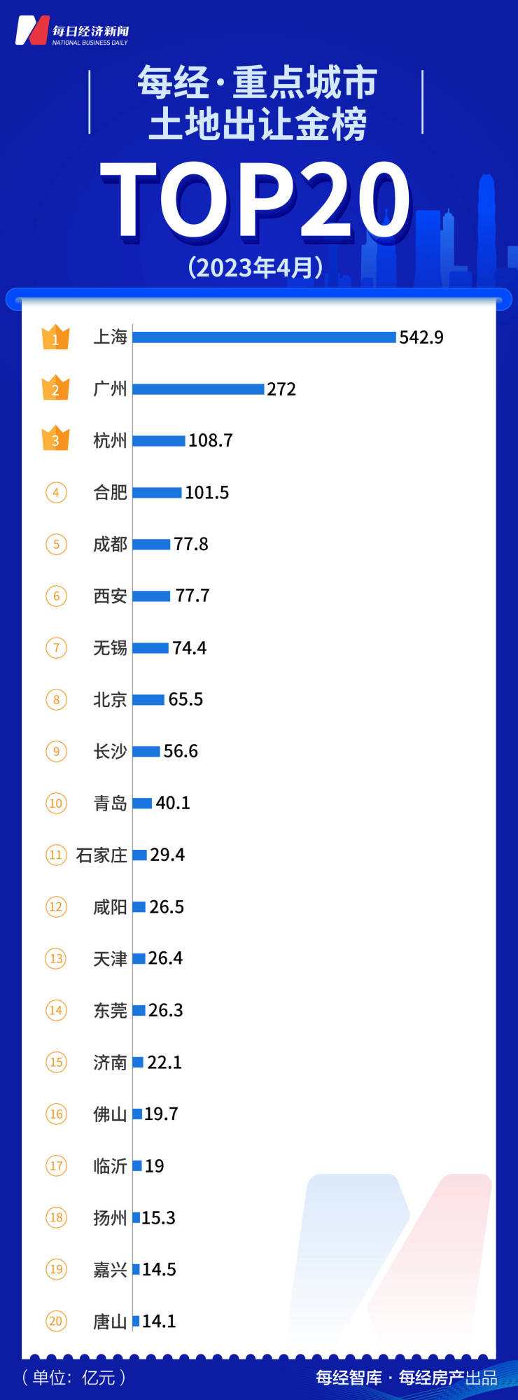 据《每日经济新闻》联合中指研究院推出的每经·重点城市土地出让金榜单榜单,从今年1月起,TOP20城市土地出让金额逐月回暖,4月份达到1630.5亿元,比3月份(1278亿元)上涨28%,连续第二个月涨幅达到28%。其中,上海、广州、杭州、合肥分别以542.9亿元、272亿元、108.7亿元和101.5亿元位列前四,也是土地出让金过百亿元的4个城市。