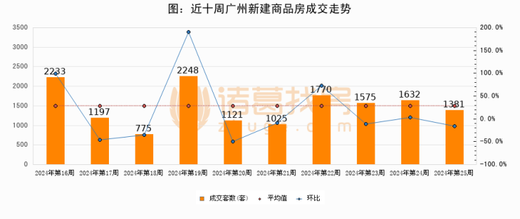 进入2024年第25周(06月17日-06月23日),广州新建商品房成交1381套,较上周减少251套,环比下降15.4%