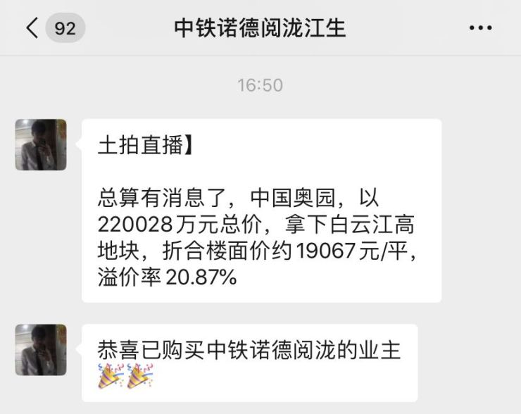 此次拍地最值得高兴的不仅是奥园,还有中铁诺德·阅泷,从项目销售的群发消息就可看出他们难以言喻的喜悦。