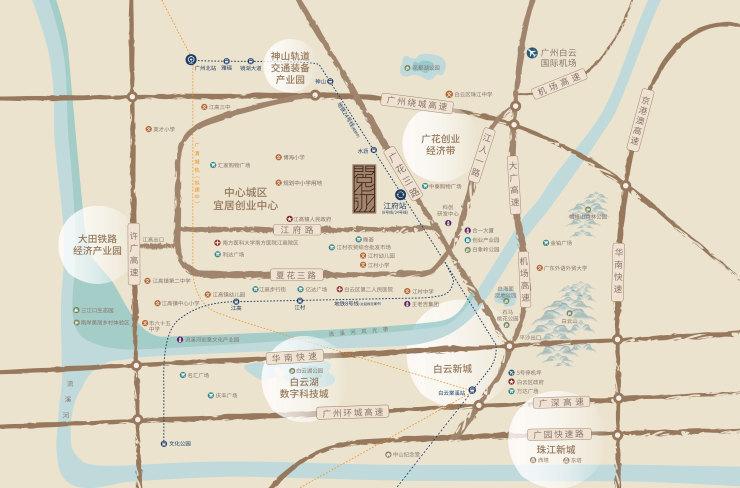 在地段交通上,中铁诺德·阅泷地处地铁8号线北延线(建设中)与24号线(规划中)的交汇站点——江府路站,是不折不扣的双地铁上盖大盘。30分钟即可通达越秀、海珠,短暂接驳后,更是可于江高轻轨站乘坐广清城际5分钟骤达棠溪TOD,10分钟即达广州火车站。据规划,未来江府路站还将进行深入打造,有望成为地铁枢纽综合体,前景无限!