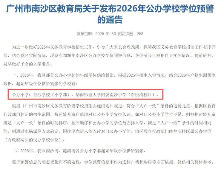 另外,南沙还有金沙学校(小学部)、华南师范大学附属南沙小学(东悦湾校区)两校,以及南沙街、港湾街各公办小学非起始年级学位供给紧张。