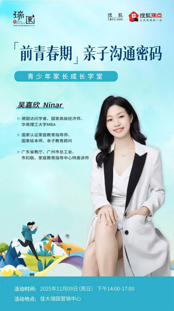 面对孩子的心理波动与沟通壁垒,如何跳出“焦虑管教”的误区?怎么将亲子间的“对抗”转化为共同成长的契机?11月9日,搜狐将联合佳大瑞园特邀知名家庭教育指导师吴嘉欣女士,为家长提供一场直面痛点的专业指导。