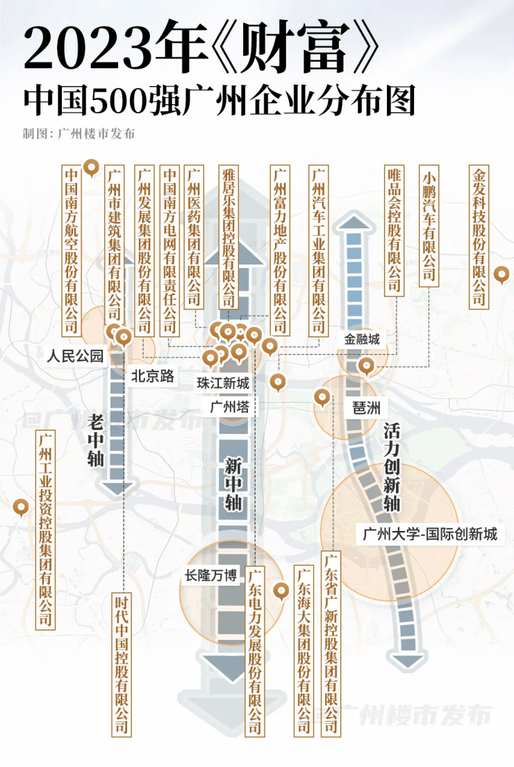 广州新中轴由南北中轴组成,空间范围从天河的梅花园,到番禺万博,纵贯南北20多公里的区域,将涵盖梅花园、广州东站、体育中心、珠江新城、广州塔、海珠湿地公园、海珠创新湾、万博等重要节点。综合数据显示,2023年财富500强中,广州有17家企业上榜,超一半在这条新中轴上;超过144栋甲级以上的写字楼,也在新中轴上,意味着这条新中轴集聚的经济活力势能,既牵引着城市的发展与格局,也带来了千亿级繁华配套的虹吸效应。正如书法家所说,“中”字一竖叫作“輥”,即轴,转动之涵义。广州新中轴,则以世界级的万千繁华,绕着中轴线转动,集万千宠爱与一身。