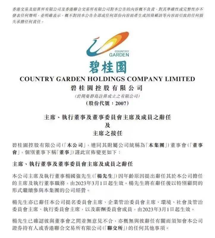 杨国强亦已辞任碧桂园提名委员会主席,企业管治委员会主席,环境、社会及管治委员会主席,执行委员会主席以及薪酬委员会成员,由2023年3月1日起生效。